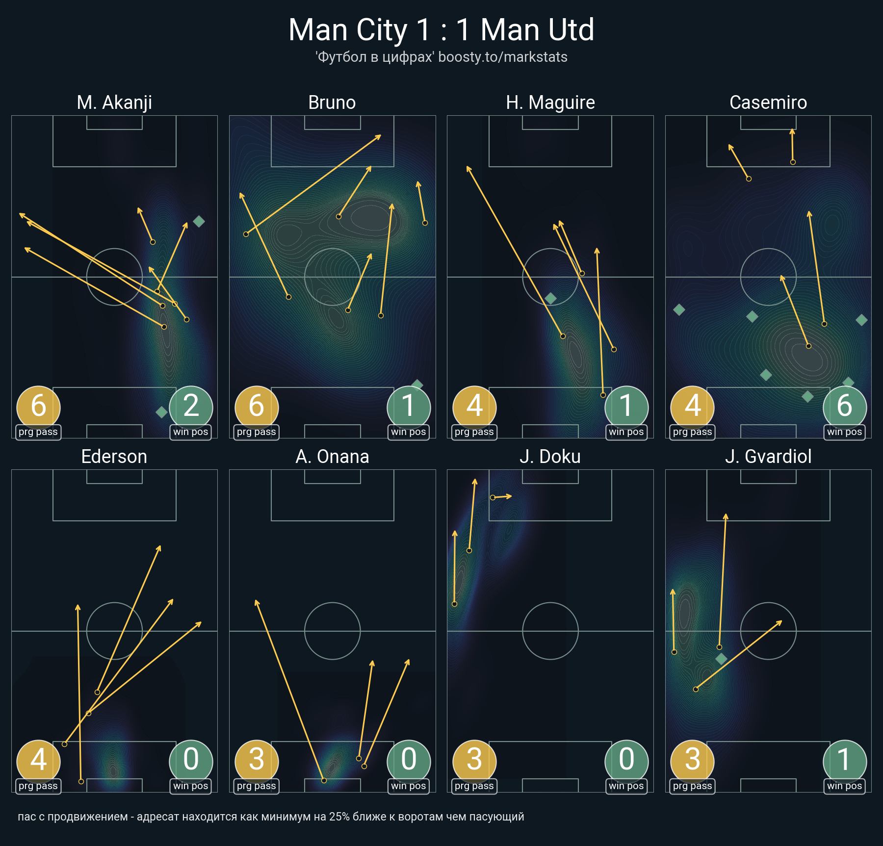 25 успешных передач из 38 попыток (1 ассист, 2 под удар, 6 с продвижением, 9 на трети соперника)