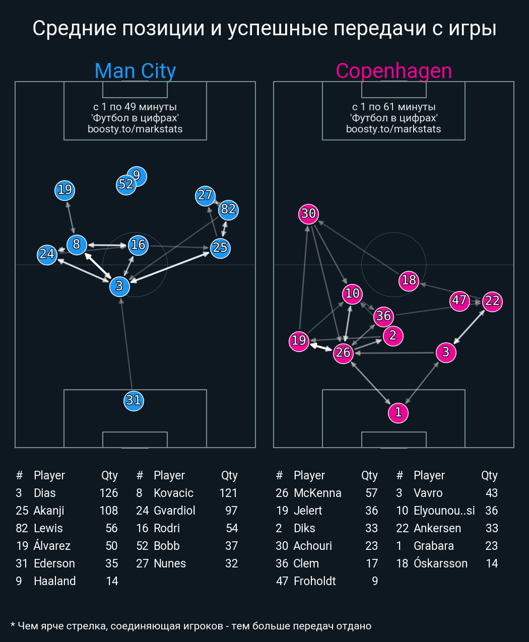 120 успешных передач из 126 попыток (2 с продвижением, 1 на трети соперника)