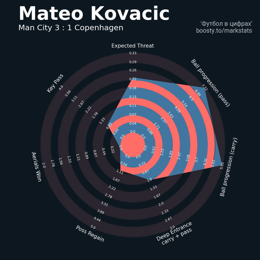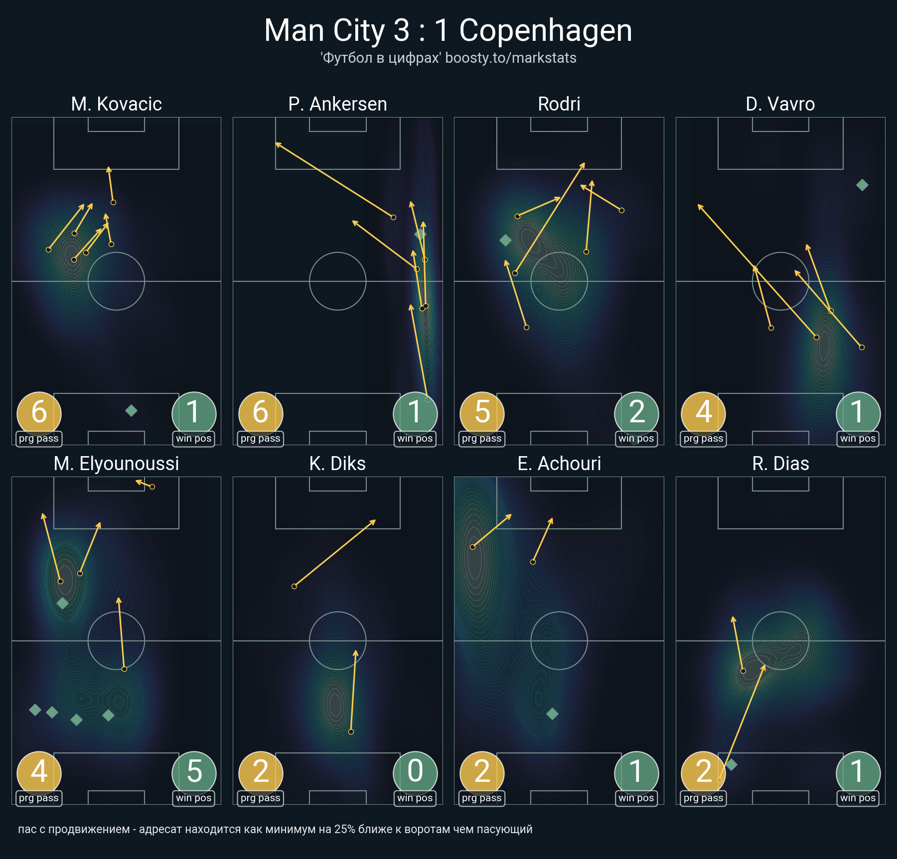 48 успешных передач из 55 попыток (1 ассист, 1 под удар, 5 с продвижением, 9 на трети соперника)