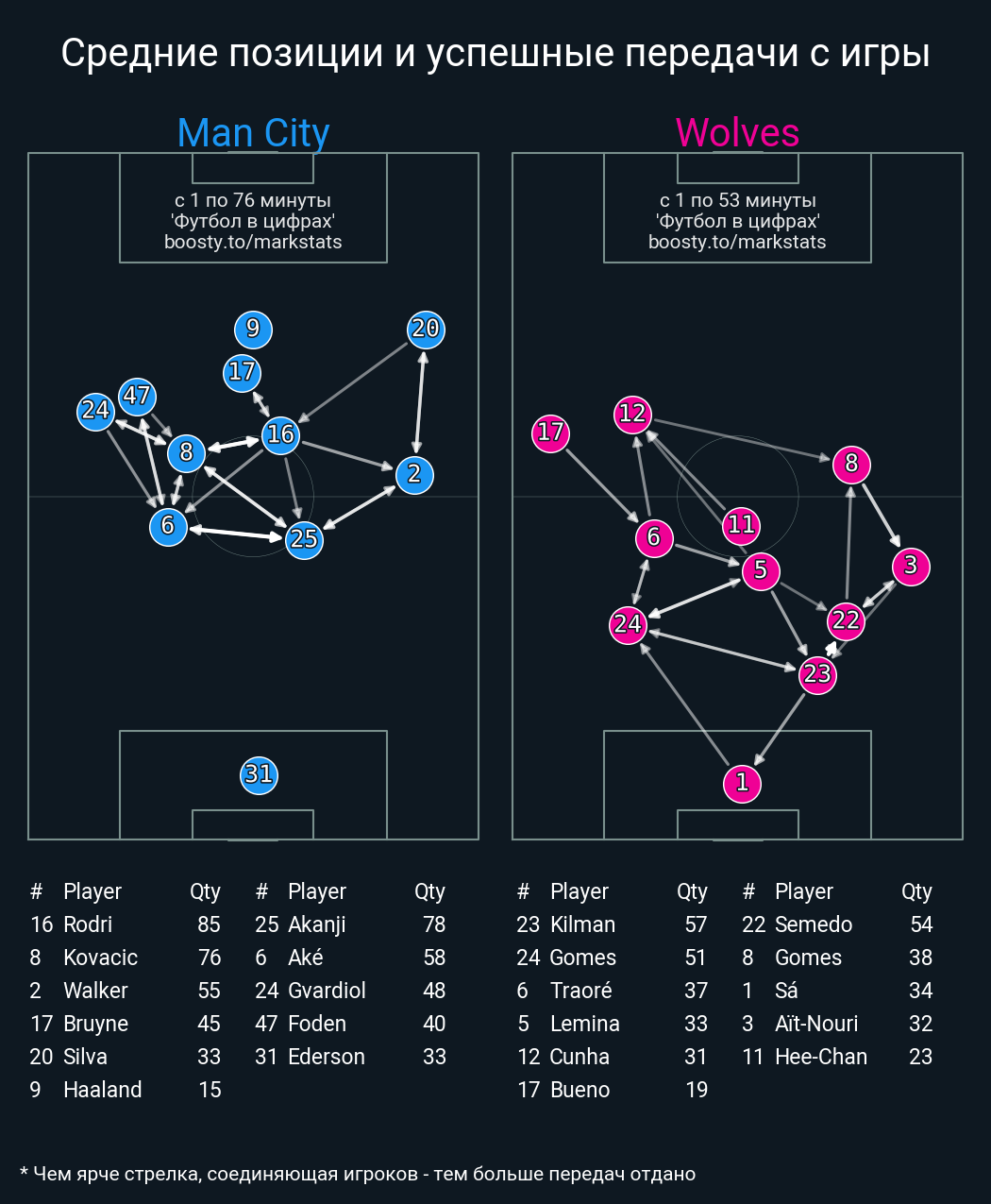 70 успешных передач из 78 попыток (3 с продвижением, 2 на трети соперника)