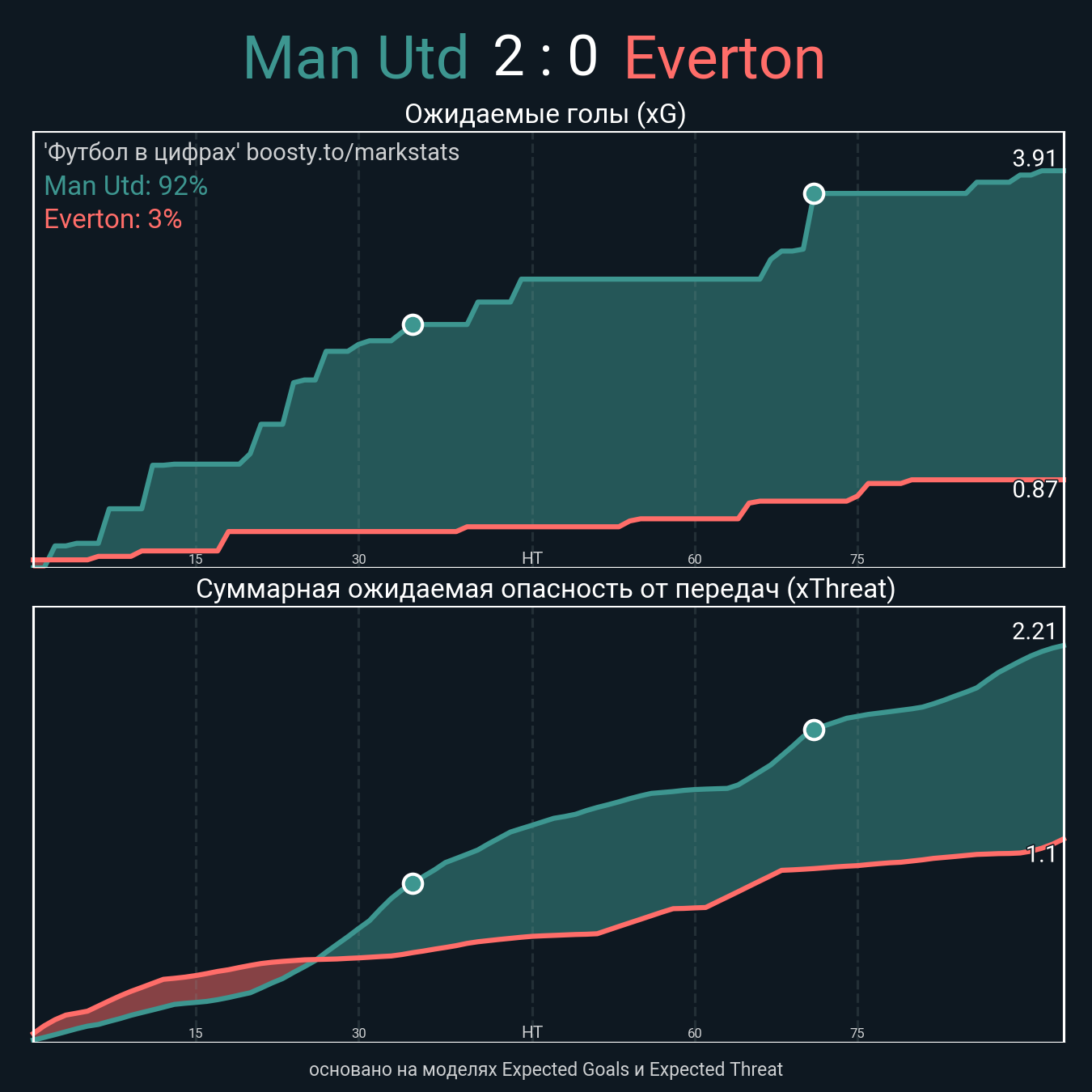 Ожидаемые голы (NPxG): 3.91 - 0.87