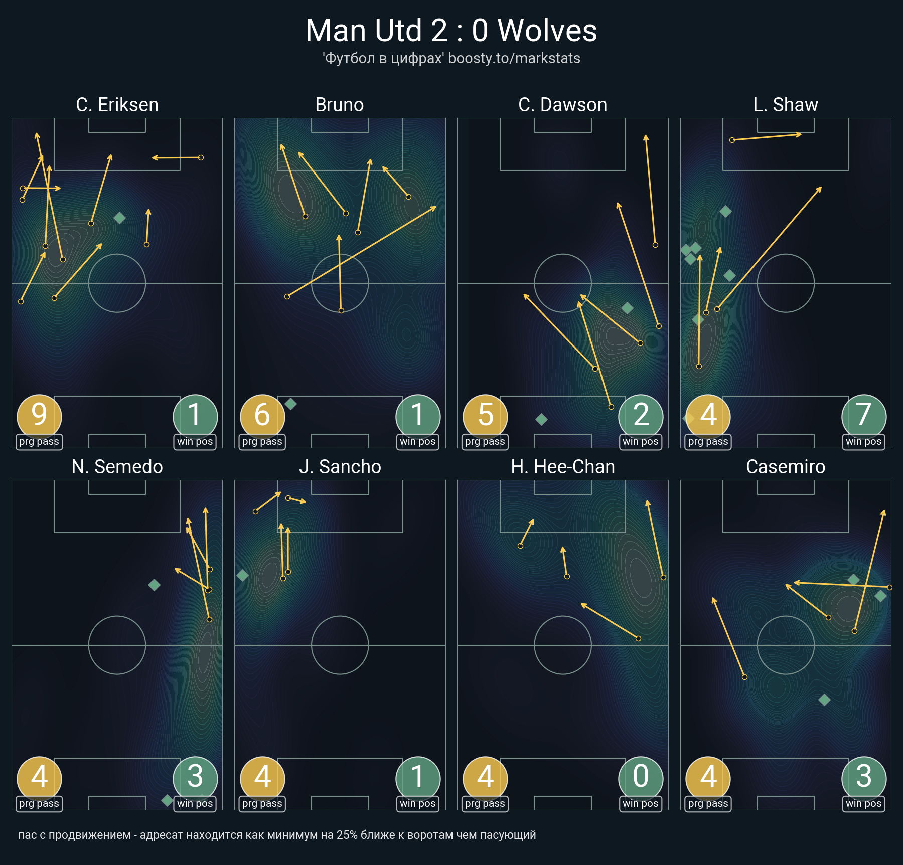 36 успешных передач из 46 попыток (1 ассист, 4 под удар, 6 с продвижением, 13 на трети соперника)