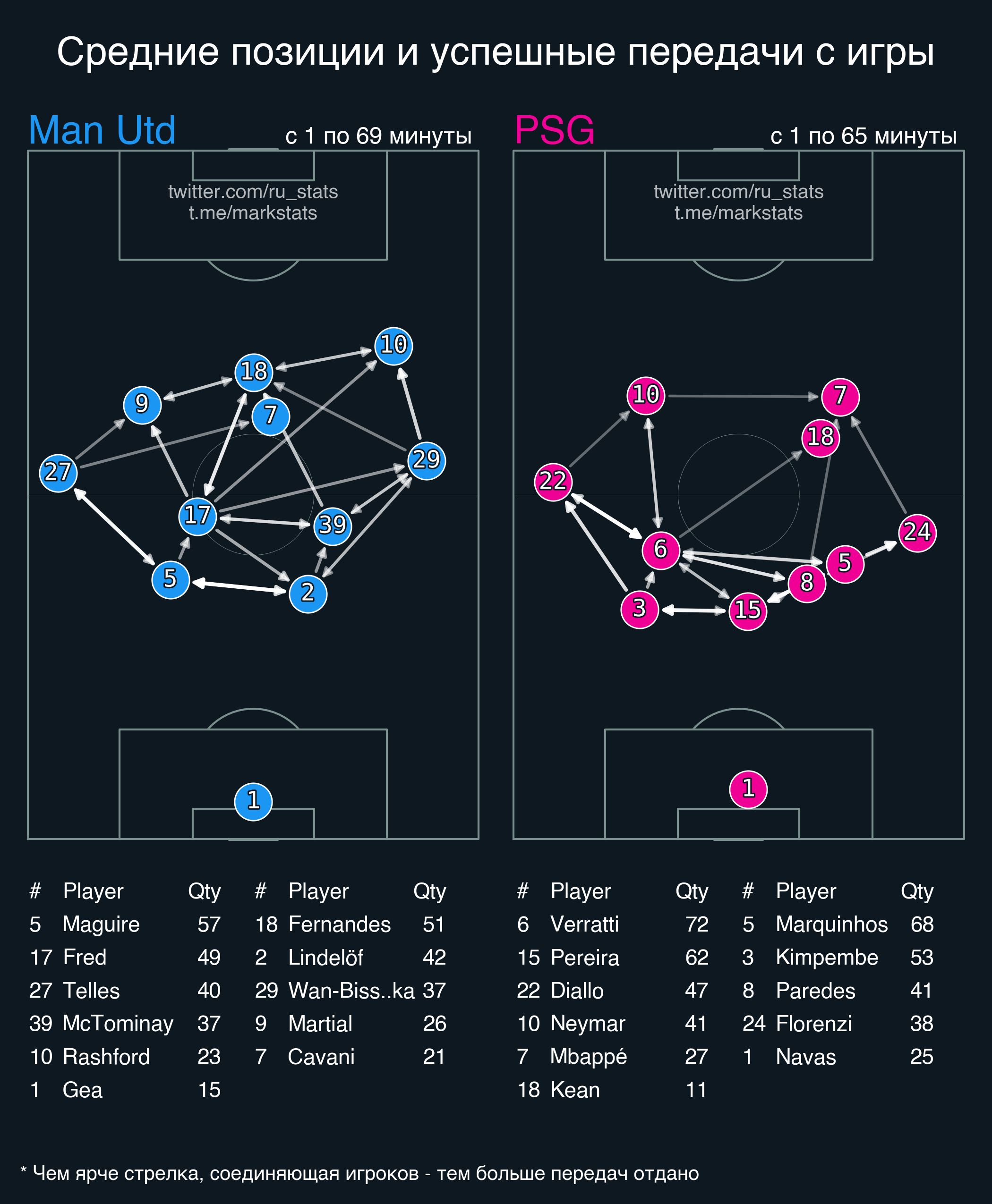 Флоренци и Марсьяль лидеры матча по количеству передач с продвижением (оба по 5). Скот Мактоминей 8 раз вернул владение мячом своей команде.