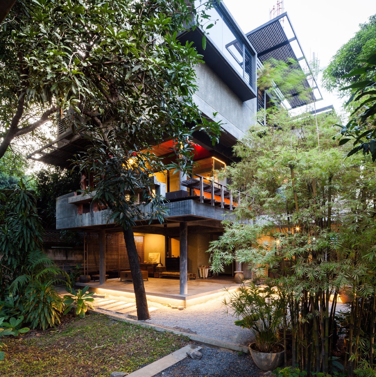 Text description provided by the architects. The site is one of the old reminding mango gardens that still exist in Bangkok, it is the reason why the house tries to insert itself into its environment. The planning of the house is layed out in a way to introduce the house in the tree-rich site, without disturbing, or cutting any of the original landscape.The house is divided into three stories, and three zones. With the intention to create different atmospheres linked to the various zones, and also giving an international modern culture feel, which fits the company's current vision.