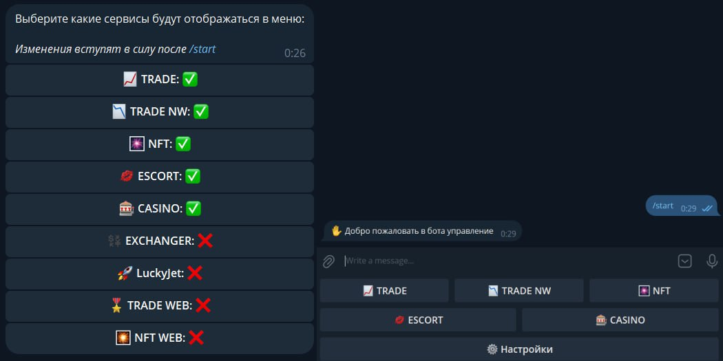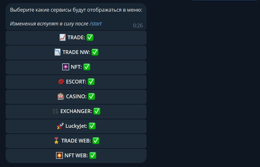 Мы видим отображение всех направлений, при нажатии на кнопку с ненужным для Вас направлением статус кнопки меняется, чтобы применить изменения нужно повторно прописать команду /start.