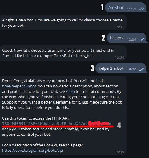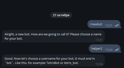 Helper попросит нас перейти в другого бота для получения токена бота. Fatherbot - это родной сервис телеги, для управления ботами.