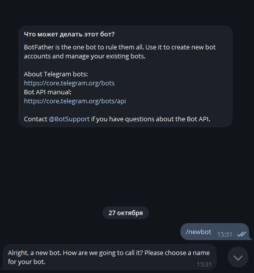 При первом входе сразу пишем команду /newbot.