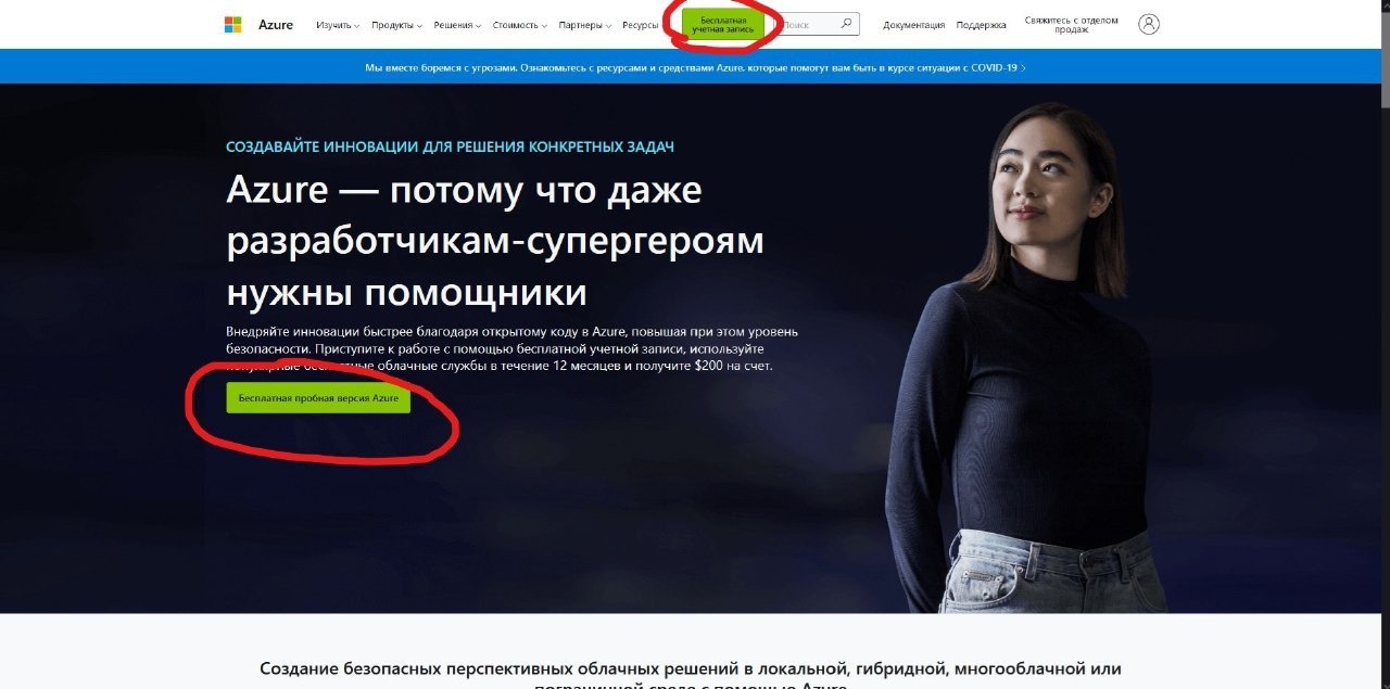 После успешной проверки карты, нас перенесёт на главную страницу Microsoft Azure, нажимаем на кнопку "Перейти на портал Azure"