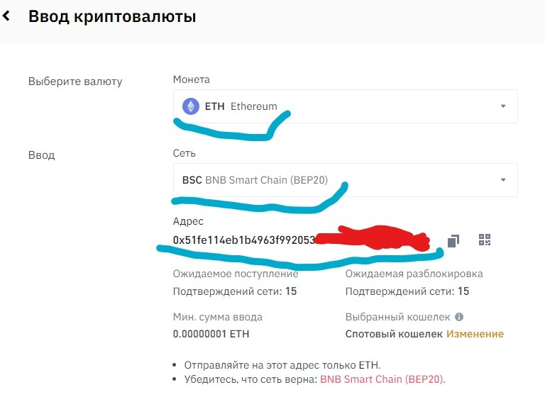 Затем в кошельке на BINANCE заходим в Ввод Криптовалют и выбираем ETH, главное выбрать соответствующую сеть , в данном случае это BEP20.