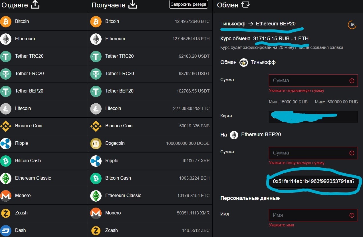 Если вы все проверили и все данные (валютная пара, курсы , сеть кошелька) выбраны верно и заполнены без ошибок, то можете начинать обмен.