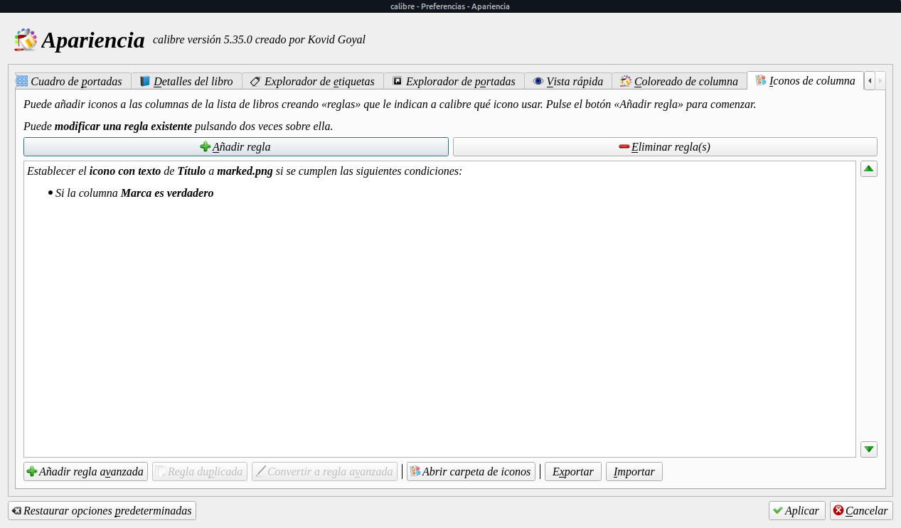 Para eso vamos a Preferencias/Apariencias y nos desplazamos con la flechita de arriba (1) hasta encontrar iconos en columnas (2) y le damos en añadir regla (3)