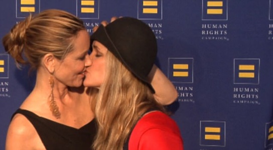 Wearing a black, draped, one shoulder jumpsuit, the 47-year-old Coyote Ugly and ER alum and her girlfriend, a media exec and human rights activist, were photographed kissing and staring at each other lovingly as they posed for photos at the 2015 Human Rights Campaign's Los Angeles Gala dinner earlier this month.