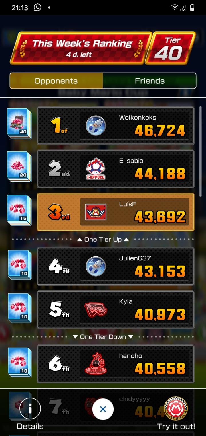 Each week of a season has a ranked cup. The goal is to get the highest scores on the 3 tracks in this cup. Staying in the top positions guarantees you an increase in the league and several rewards such as rubies, points tickets and level tickets to improve drivers, karts and gliders.