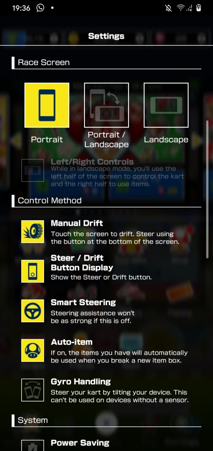 In the other configuration, the kart does not jump when tapping the screen, which results in it steering when sliding the fingers on the screen. After steering for a while, the kart starts auto-drifting and charging Mini-Turbos and Super Mini-Turbos, but not Ultra Mini-Turbos that are only charged when drifting.