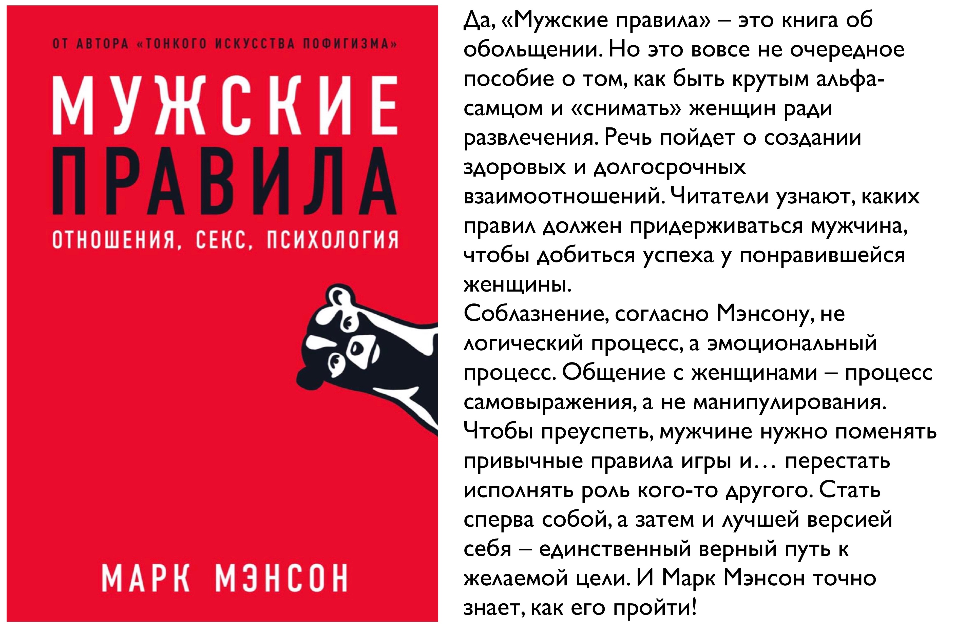 Моя цель — поспособствовать тому, чтобы вы по-новому взглянули на свои эмоции и действия, и заодно снабдить вас практическими советами по самосовершенствованию и достижению целей. Если вы ищете книгу, которая распишет до мелочей, какие фразы говорить и каких мест на теле касаться, то «Мужские правила» не оправдают ваших ожиданий — как и любая другая книга с подобными советами, поскольку все эти рекомендации не касаются сути ваших проблем.