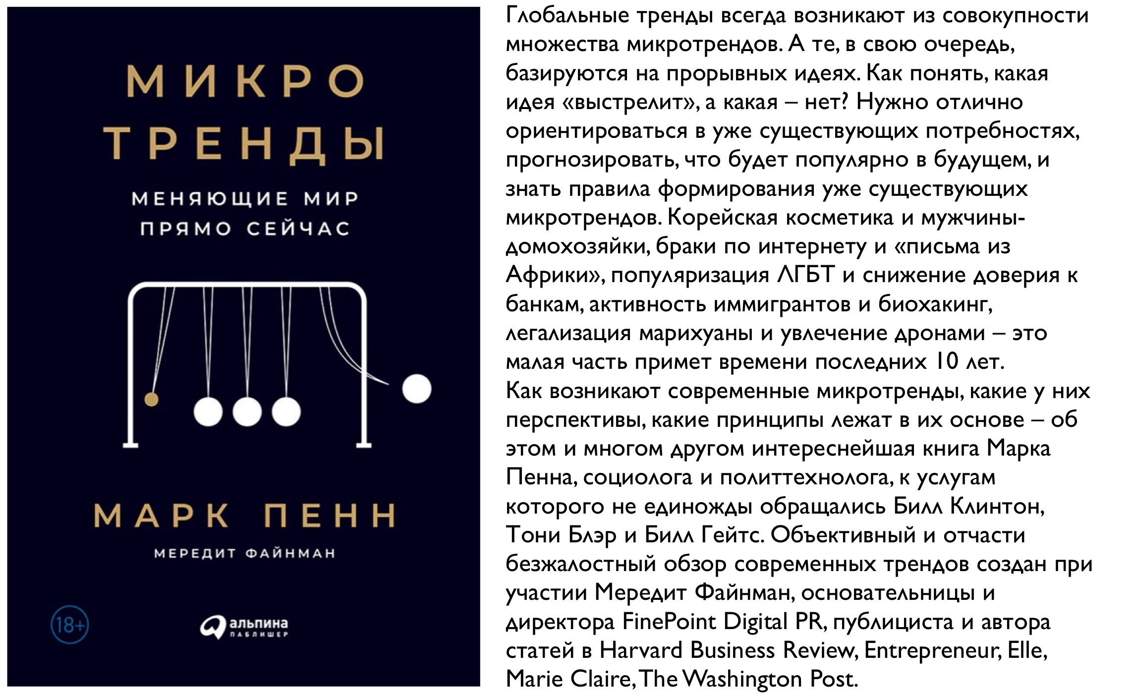 Мы живем в мире микротрендов. Им движут относительно небольшие, разрозненные и часто разнонаправленные закономерности человеческого поведения, влияние которых тем не менее очень велико. Мир полон таких закономерностей, мы называем их микротрендами. Каждая из них – мазок на всеобъемлющей импрессионистской картине мира, оживающей, стоит окинуть ее более отстраненным и целостным взглядом. За последние годы влияние этих факторов лишь усилилось, и они начали перестраивать наше общество.