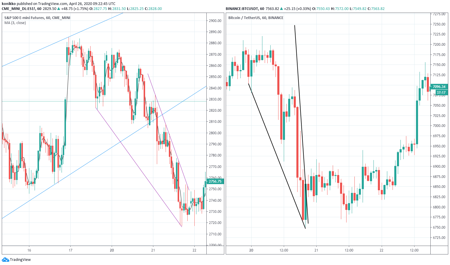 SPX fell, it fell very fast. Yes, it was overpriced, but it found it's bottom for that moment. Same Descending wedge was created on Bitcoin. Coincidence? Philosophy behind descending wedges is not simple, wedge is not as common as reader might think, not every fall produces wedge, like not every Indian is a programmer. Wedge is volatile, for it to create, price needs to go up and down multiple times, leaving trader confused.