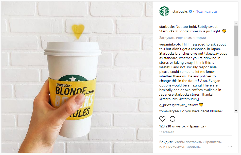 Starbucks используют соцсети для общения с поклонниками и клиентами, оно выдержано в том же стиле, что и беседы с бариста в кофейнях бренда. Поддерживая активное присутствие в соцсетях, Starbucks укрепляют связь с аудиторией.