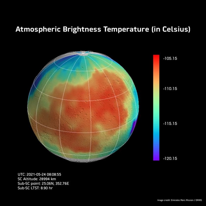 Зонд "Надежда" находится на относительно высокой орбите от 20 000 до 43 000 км над поверхностью Марса. Эта точка обзора позволяет космическому аппарату одновременно изучать целое полушарие. Таким образом, большую часть года он проводил исследования погоды на Красной планете с помощью своих инструментов - инфракрасного и ультрафиолетового спектрометра. Зонд также внимательно отслеживает температуру на поверхности Марса.