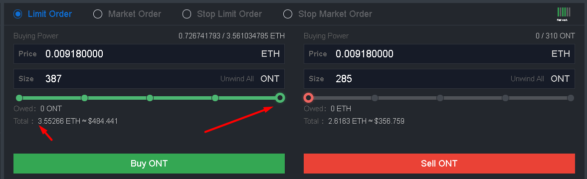 Наш Buying Power, или простым языком, кол-во эфира, на которое мы можем купить Петин Ontology. Соответственно покупка на 0.72 эфира с 1 плечом , а на 3.56 ETH - с нашим максимальным 5 плечом.