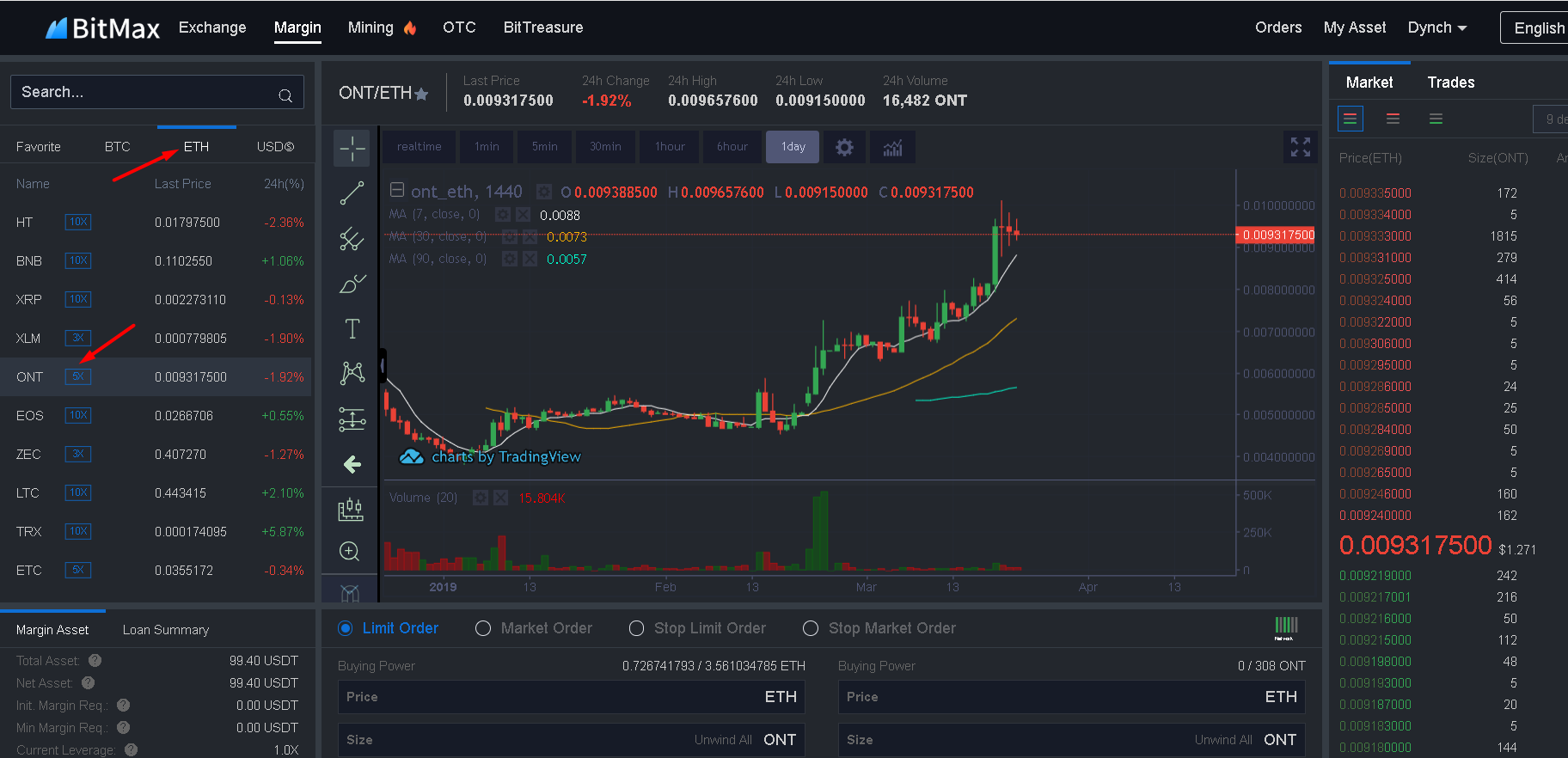 Переходим в раздел Margin и открываем торговые пары к эфиру. Ищем ONT.