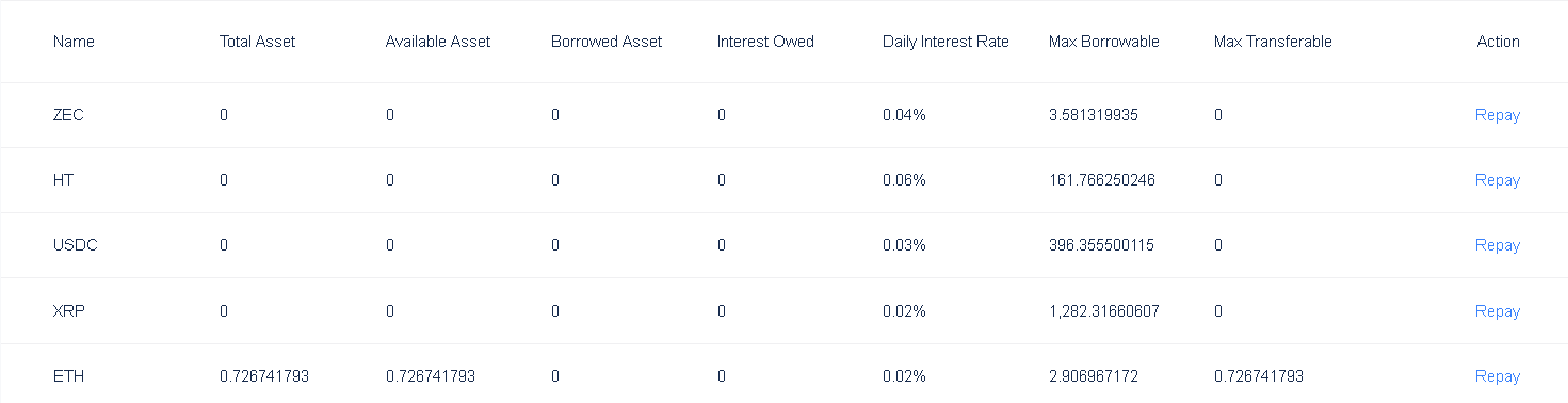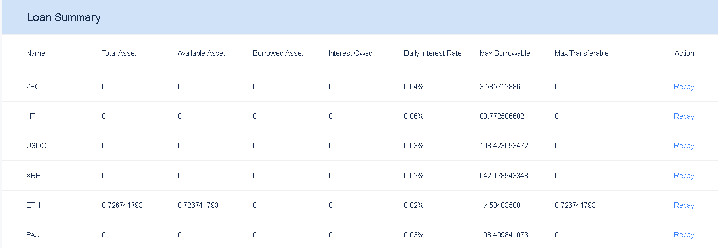 Переходим в раздел My Asset -> Balances, и далее справа жмём на кнопку Loan History. Нас интересует Loan summary.