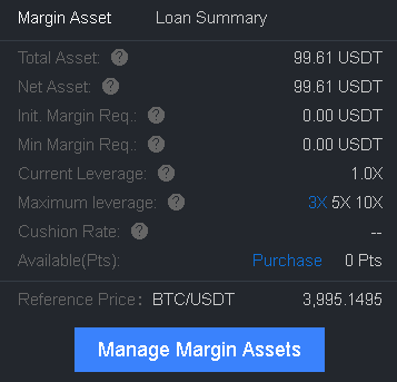 На боковой панели видим, что Total Asset и Net Asset теперь равны 100$. Размер текущего плеча (Current leverage) 1.0X (оно и логично , мы пока не занимали средств)