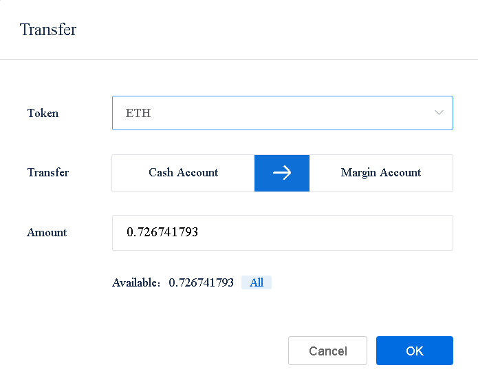 Для этого тыкаем на кнопку Transfer в разделе Balances, вводим нашу валюту, и ниже в разделе Amount вводим кол-во, которое хотим перевести на маржинальный аккаунт.