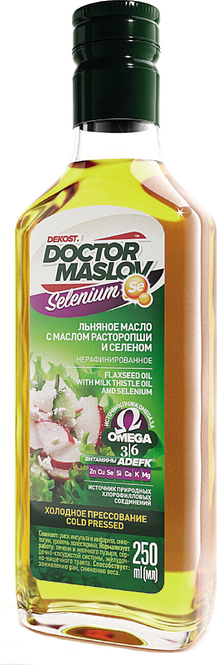 Масло льняное Масло пищевое «Льняной Доктор» с маслом расторопши и селеном Состав: льняное масло, масло расторопши, селен . Содержащиеся в масле пищевом «Льняной Доктор» силимарин (компонент масла расторопши) и селен обеспечивают высокую антиоксидантную активность этого полезного растительного продукта .