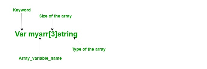 - Использование ключевого слова var : в языке Go массив создается с использованием ключевого слова var определенного типа с именем, размером и элементами.Синтаксис: