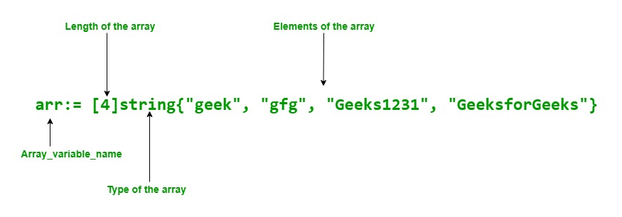 myarray:= [...]string{"GFG", "gfg", "geeks",