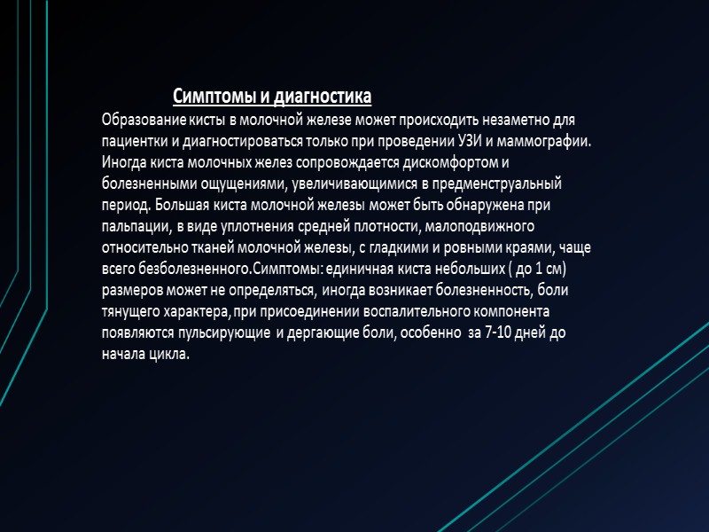 Киста молочной . . . Мастодинон при фолликулярной кисте . . . Кульдоцентез при кисте яичника - процедура, вследствие которой кисту освобождают от жидкости, . . .