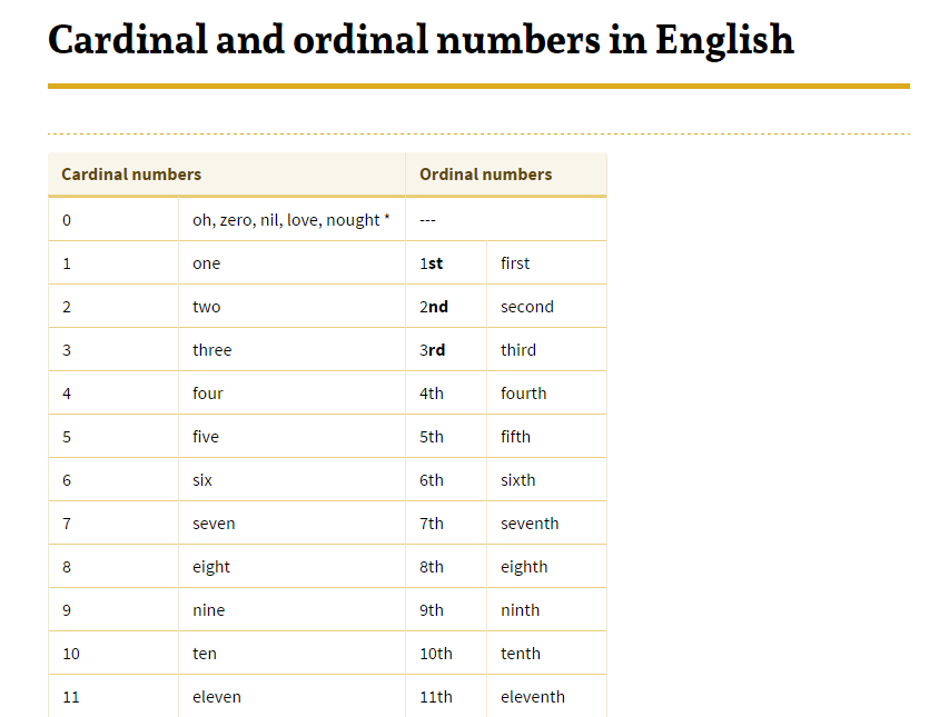Match the cardinal numbers to the