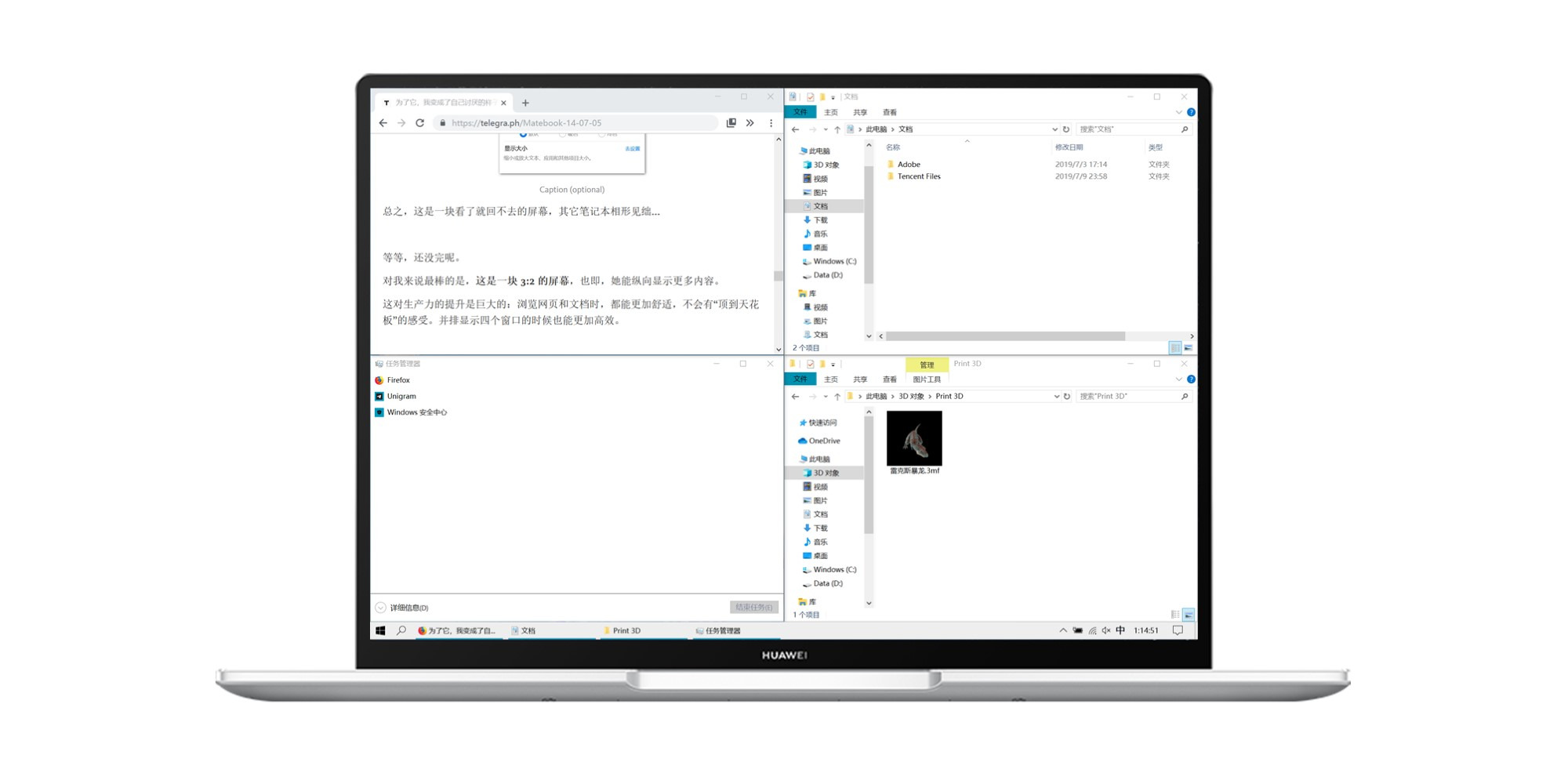 这对生产力的提升是巨大的:浏览网页和文档时,都能更加舒适,不会有“顶到天花板”的感受。并排显示四个窗口的时候也能更加高效。