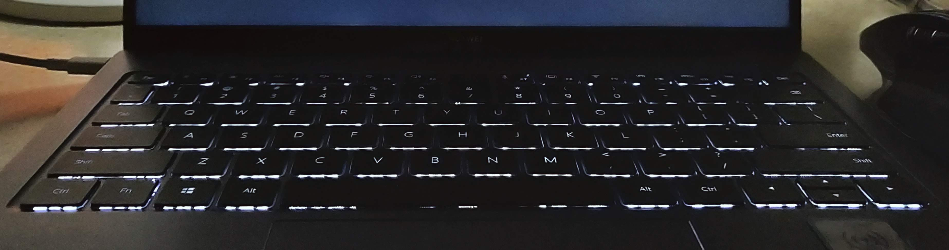 最上方是一排功能键,有键盘背光,音量和亮度调整,投影,麦克风和 WIFI 的开关,和华为电脑管家的启动键。