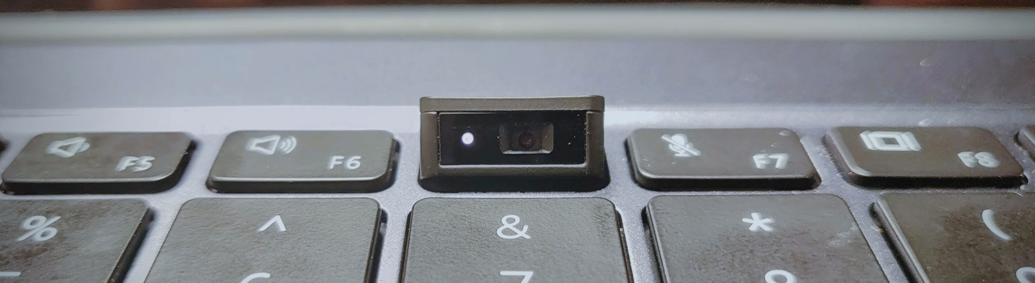 摄像头放在了键盘里,支持 720P 视频,采用弹出式设计,启用时旁边会亮灯。这样的设计,就不需要再贴胶带了,非常和谐。