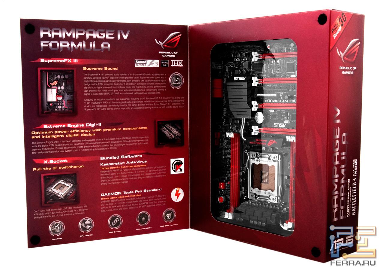 Материнская плата ASUS Rampage IV Formula упакована в характерную для продуктов ROG-серии коробку, в оформлении которой преобладает красный цвет и его различные оттенки .