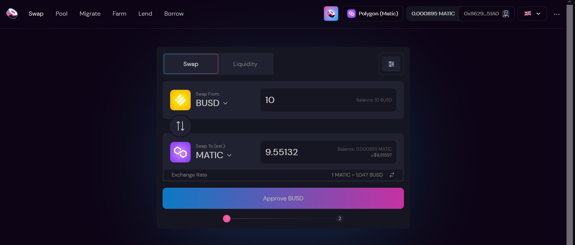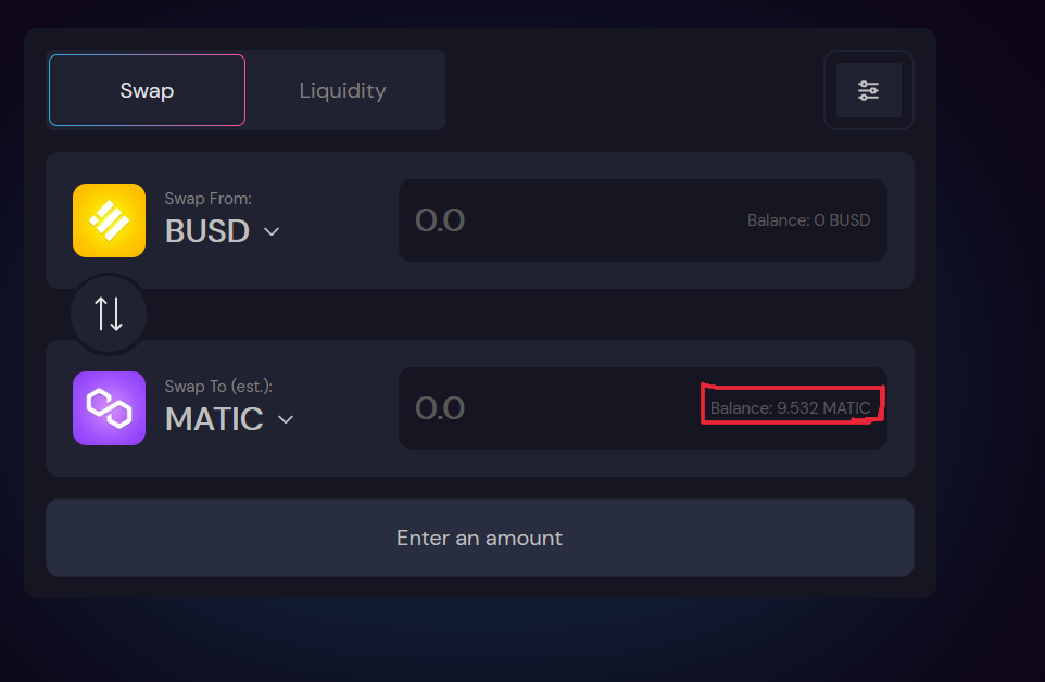 6) Import Contract : 0x9fb83c0635de2e815fd1c21b3a292277540c2e8d And Swap BUSD To MATIC