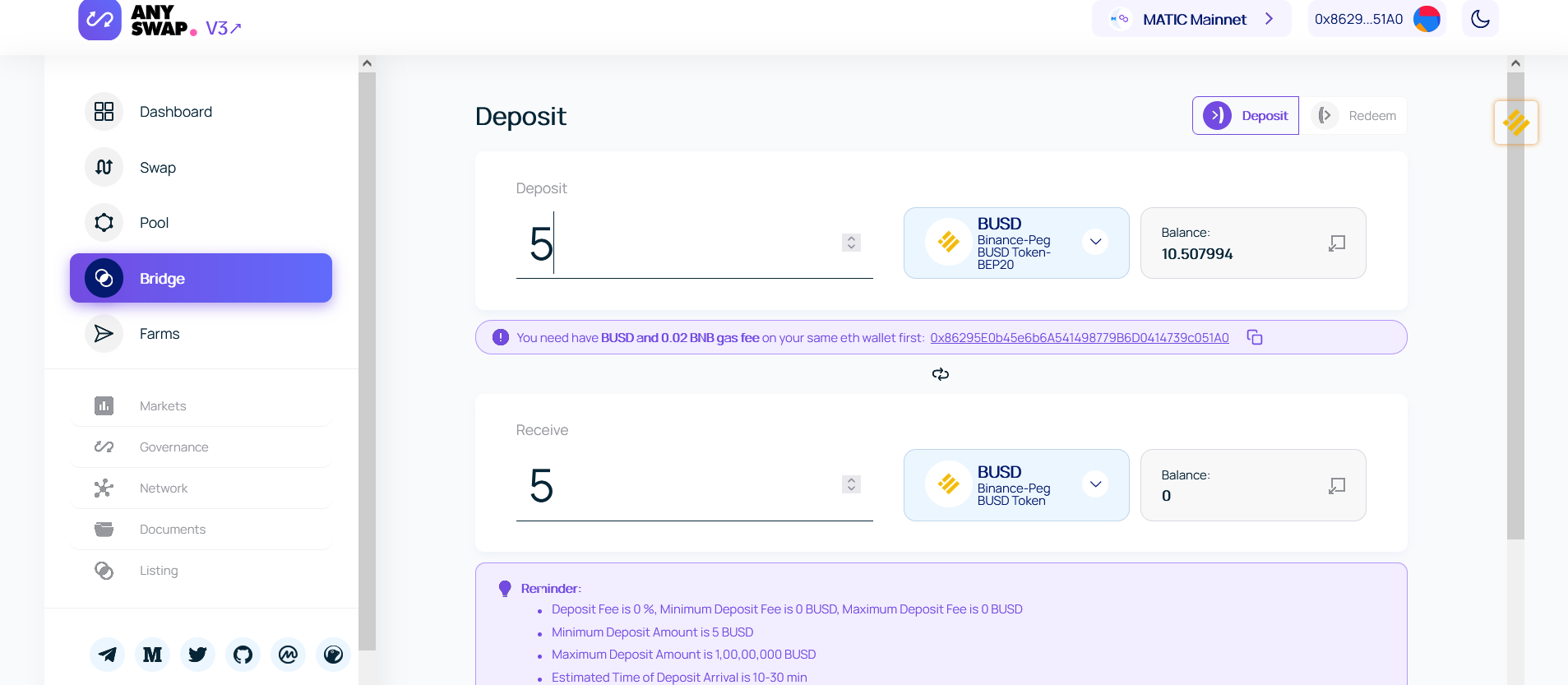 4) Click On Cross Chain Deposit And Within 10 Minutes You Will Receive BUSD On MATIC Chain