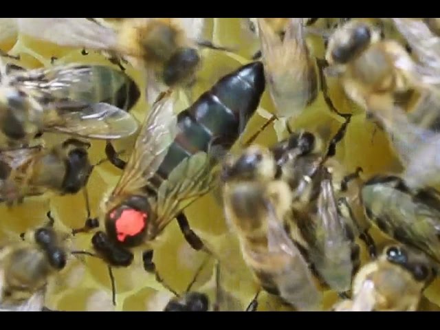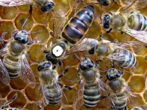Как выглядит матка пчелы, видно на фото (в окружении рабочих пчел) и крупным планом: Молодая матка вида Бакфаст