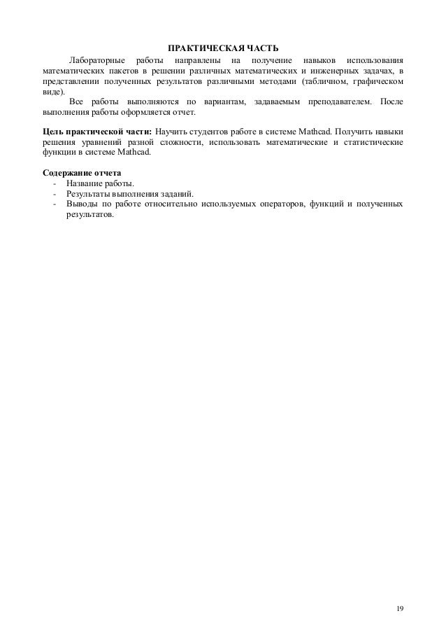 Для освоения основных приемов работы в MathCAD выполняются 5 лабораторных работ: 1 . Основы работы с MathCAD; 2 . Построение графиков; 3 . Вектора и матрицы; 4 . Решение уравнений; 5 . Символьные вычисления .