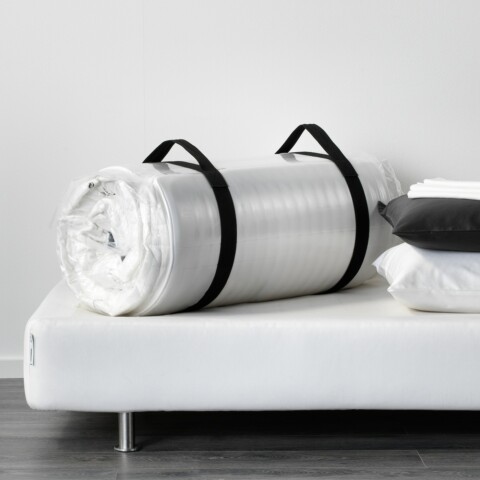 Скрученный в рулон двусторонний ортопедический матрас с эффектом «памяти» формы тела. Чехол — жаккард.
