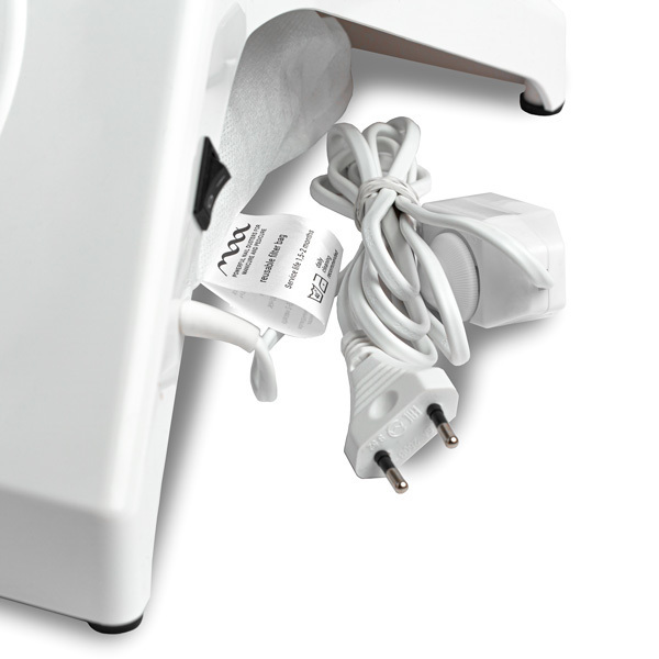 Фирменная система установки мешочка Easy On. Благодаря тому, что длина резинки фильтра регулируется, снимать и надевать его стало значительно удобнее, чем у обычного маникюрного пылесоса.