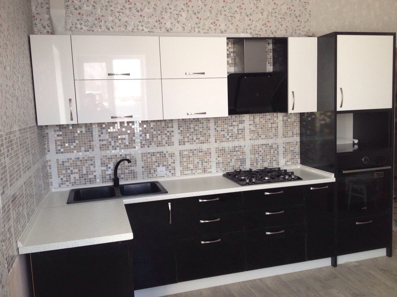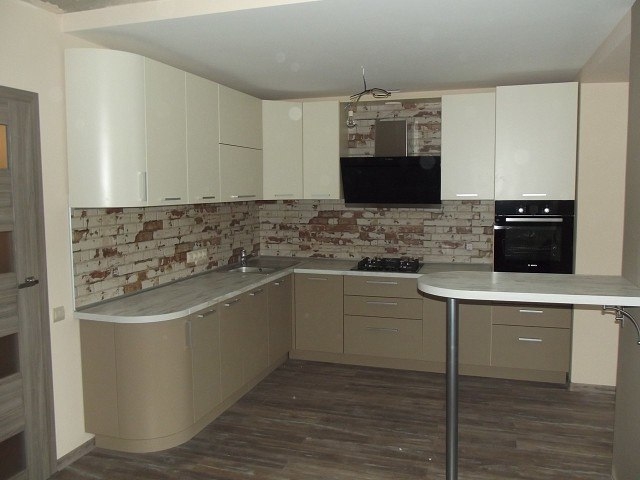 В Синявино это было))Проект не из легких,но все таки осуществимый,как это видно на фото . Фасады и столешница МДФ в пластике, фурнитура использовалась разного производства,средней ценовой . . .
