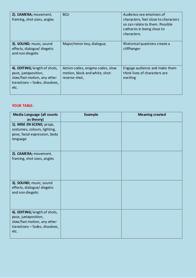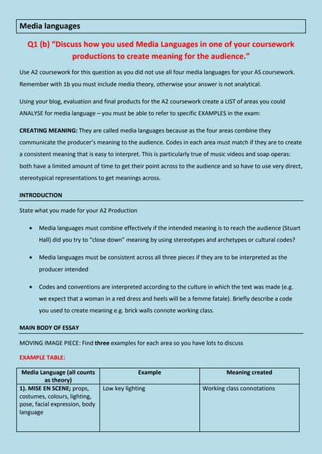 1b . Media Languages essay plan and theory . 1 . Media languagesQ1 (b) "Discuss how you used Media Languages in one of your courseworkproductions to create meaning for the audience ."Use A2 coursework for this question as you did not use all four media languages for your AS coursework .Remember with 1b you must include media theory, otherwise . . .