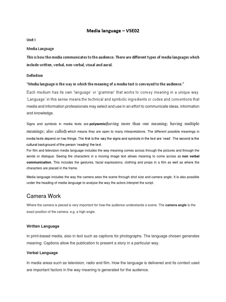 Section A - Media Language Essay . Media language is the means by which a creator implements a meaning into their text, for it to be either consciously or unconsciously decoded by the audience . All media texts are constructed through signs, as meanings can be communicated to the audience through words, images, gestures and sounds .