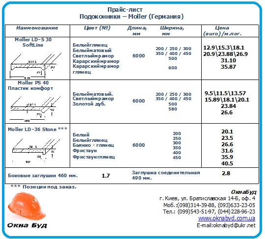 Подоконники Меллер ― это композитные подоконники из древесно-пластиковой смеси LIGNODUR с покрытием ELESGO plus on Top . Цена от 395 грн . за 1 м .п, из расчёта подоконника Moeller шириной 100мм и длинной 1000мм без заглушек . Декоры: белый, золотой дуб, светлый дуб, белый мрамор, махагон . — длина . . .