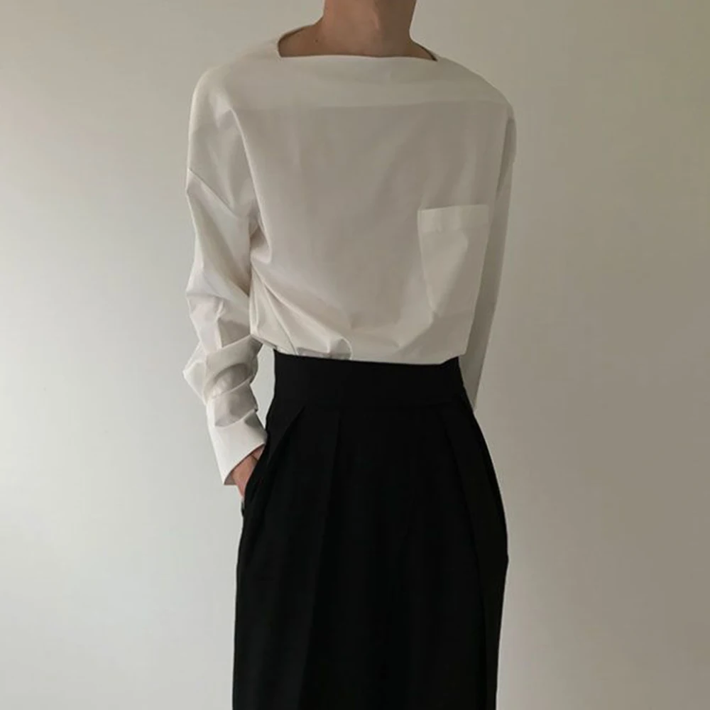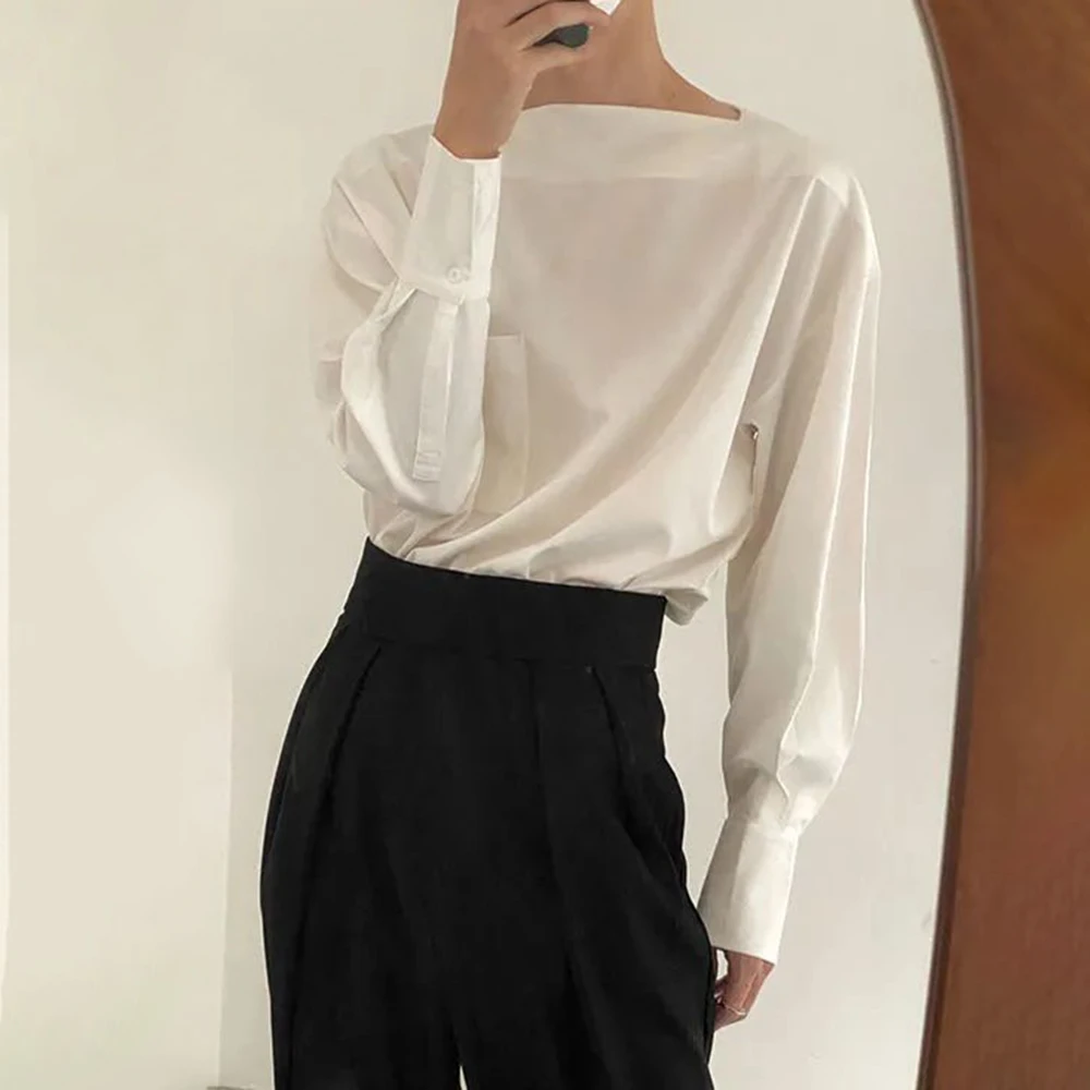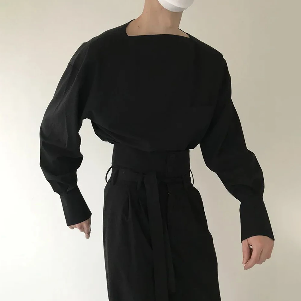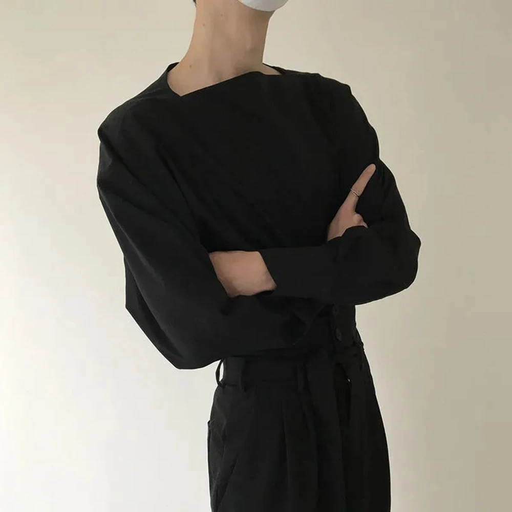 Mens Advanced One-neck Tops 2023 Spring New Loose Design Sense Niche Long-sleeved Shirts Solid Color Temperament Neutral Clothes - Купить с бесплатной доставкой