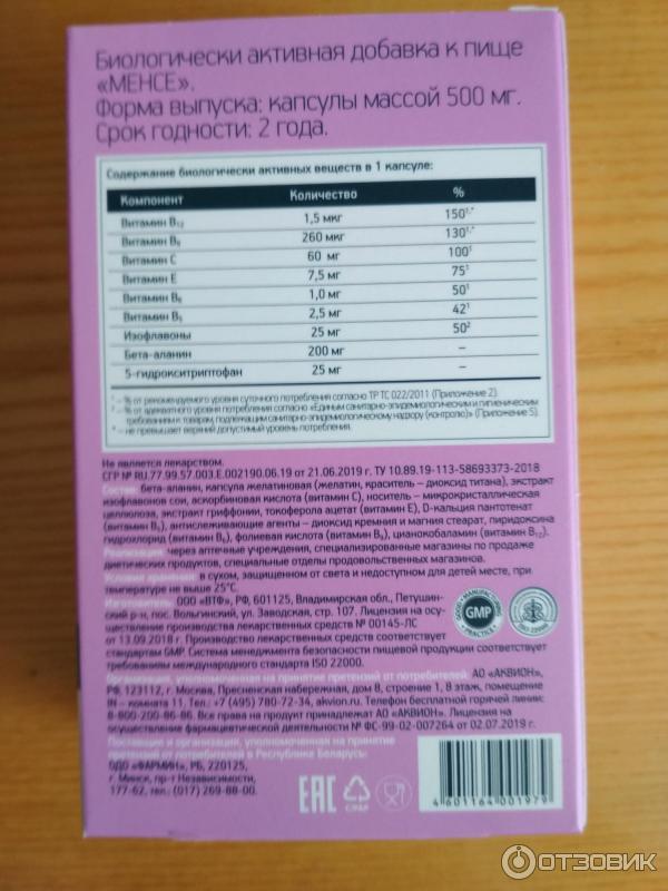 Менсе в виде капсул показан женщинам в качестве биологически активной добавки к пище, содержащей бета-аланин, изофлавоны, 5-гидрокситриптофан, витамины b5, b6, b9, b12, c, e .