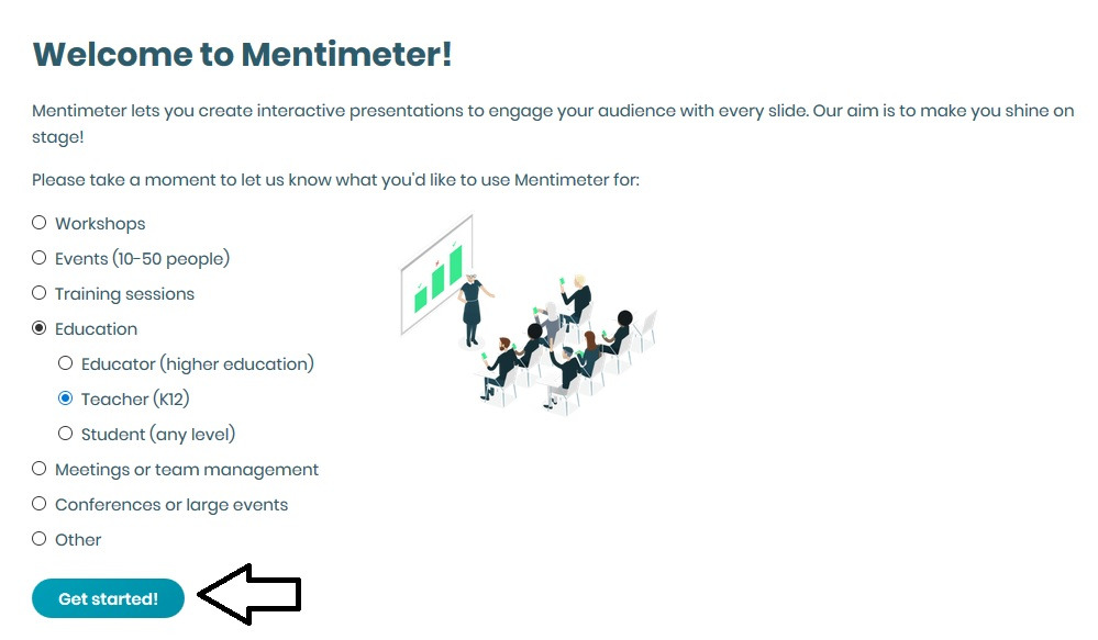 4. Selepas anda sign up mentimeter... Anda dikhendaki klik beberapa perkara yang menyebabkan anda menggunakan mentimeter ini. Jika anda seorang guru klik education dan jika selainnya klik pilihan yang ada. Selapas itu, anda klik Get Started!